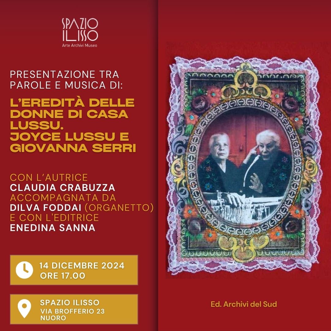 Vi aspettiamo domenica 15 dicembre, alle ore 17.00, per la presentazione del libro "L'eredità delle donne di Casa Lussu. Joyce Lussu e Giovanna Serri", edizioni Archivi del Sud. L'editrice Enedina Sanna dialoga con l'autrice Claudia Crabuzza con la partecipazione di Dilva Foddai all'organetto.